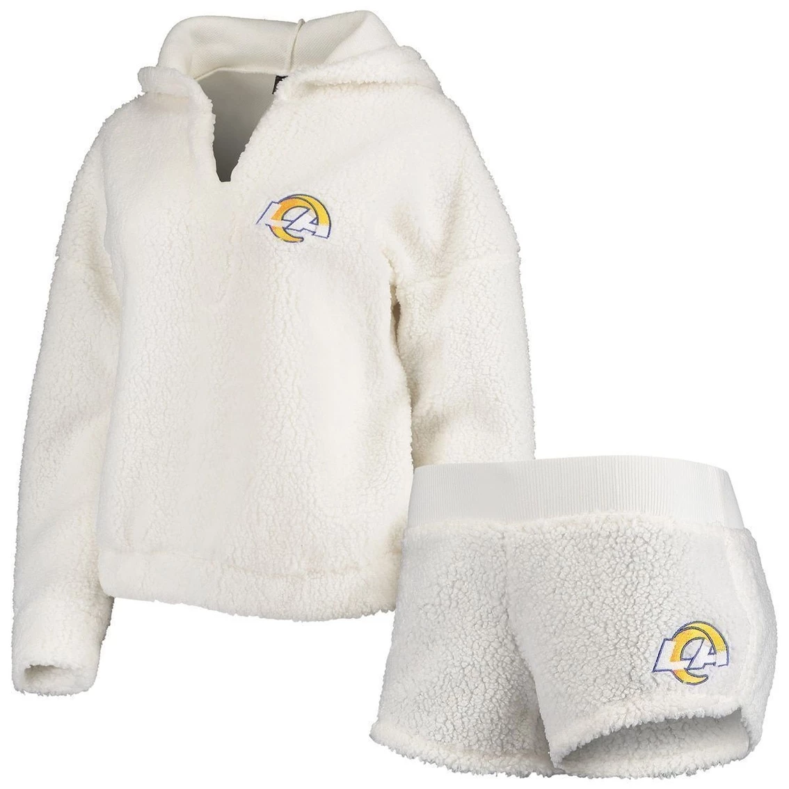 - Supporting the Los Angeles Rams is cozier than ever with this Fluffy hoodie top and shorts set from Concepts Sport. Designed with soft, sherpa fabric, this set is perfect for streaming games from the comfort of your home. The embroidered appliques on both the top and shorts help you rep the Los Angeles Rams in style.