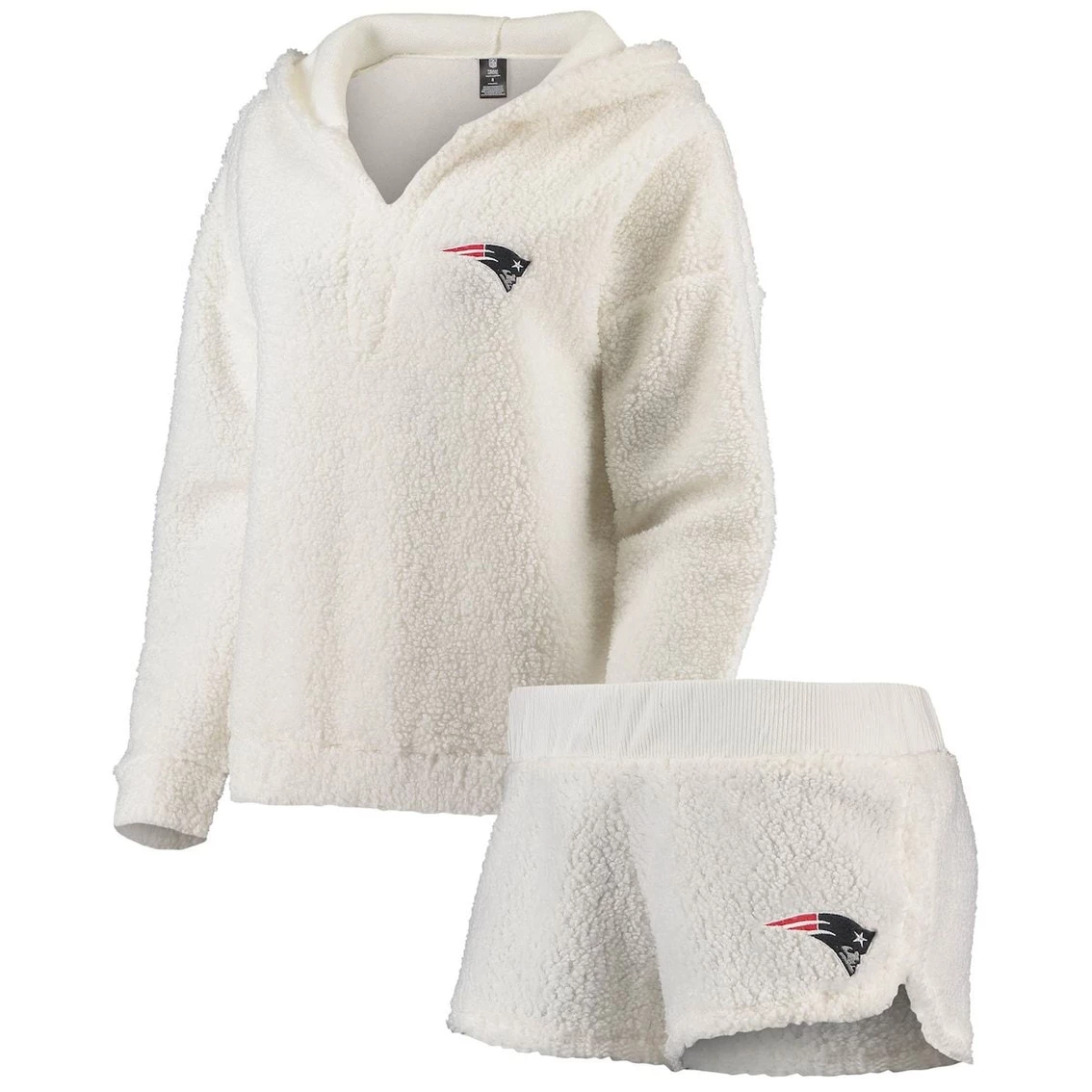 - Supporting the New England Patriots is cozier than ever with this Fluffy hoodie top and shorts set from Concepts Sport. Designed with soft, sherpa fabric, this set is perfect for streaming games from the comfort of your home. The embroidered appliques on both the top and shorts help you rep the New England Patriots in style.