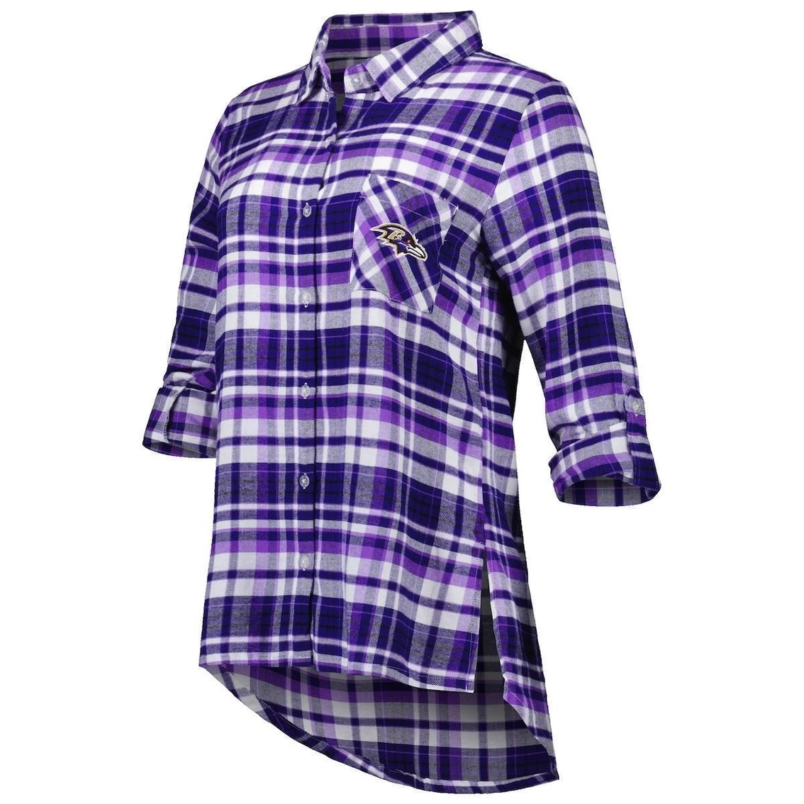 - Even when you’re dreaming, you can show off your unwavering Baltimore Ravens fandom with this Maintstay Flannel nightshirt from Concepts Sport. It features the team logo embroidered on the chest and a woven plaid pattern comprised of their iconic colors. Pin-up sleeves and a rounded droptail hem make this Baltimore Ravens top great for dozing off in style.