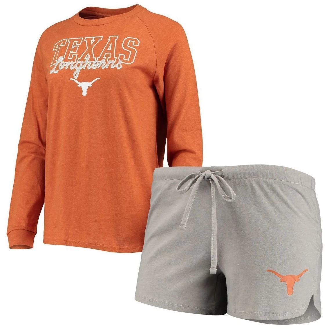 - Sometimes you like to cheer on your Texas Longhorns from the comfort of your home, and this Concepts Sport T-shirt and shorts sleep set makes it that much easier. It includes a cozy raglan tee and bottoms with sleek graphics and team colors for a full squad look. Finished with an adjustable waistband for the perfect fit, you will feel extra comfortable while rallying your Texas Longhorns to victory.