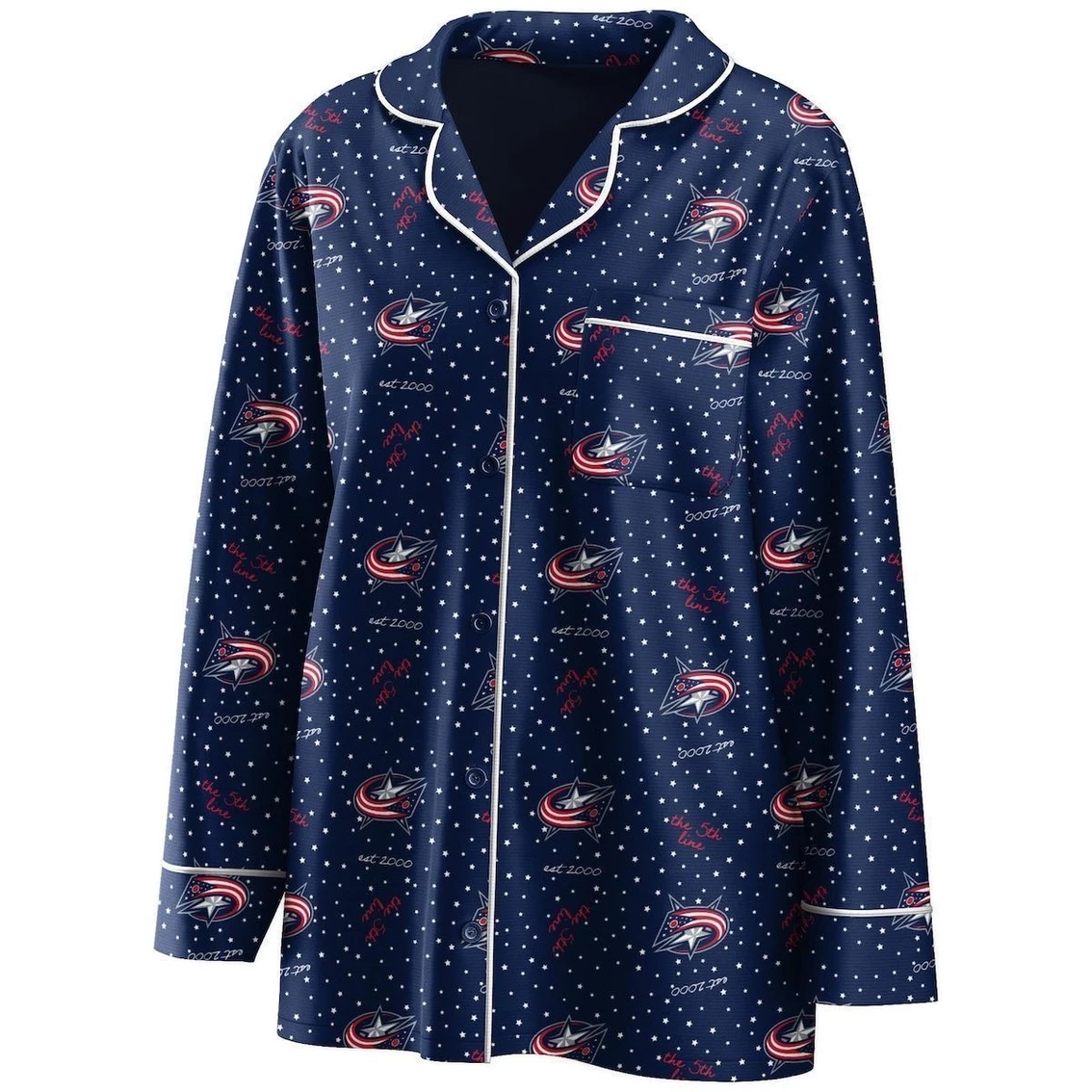 Hot Sale β¨ Women's WEAR By Erin Andrews Navy Columbus Blue Jackets Long Sleeve Button-Up π Shirt & Pants Sleep Set π